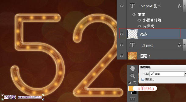 9、在两个字体图层之间新建图层"亮点",确保前景色为#ffb94a,右击描边路径。