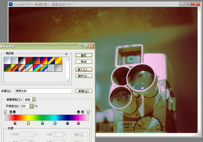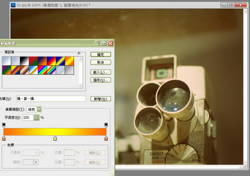 在使用渐层对应的时候,可以考虑不同的色彩配搭,就试试预设集的一堆吧,例如橙黄色这个,怀旧得来比较明快呢。