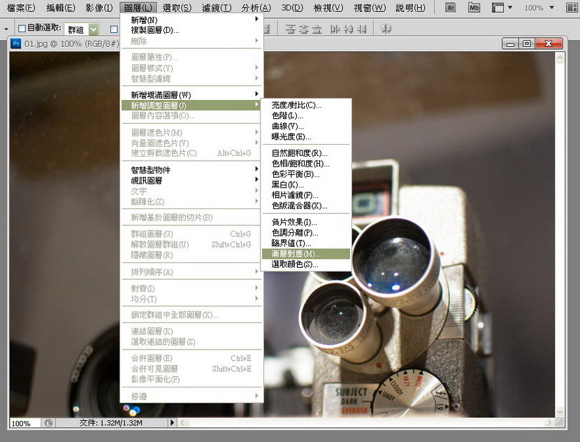 2) 新增一个调整图层 (adjustment layer)"渐层对应"(Gradient Map)