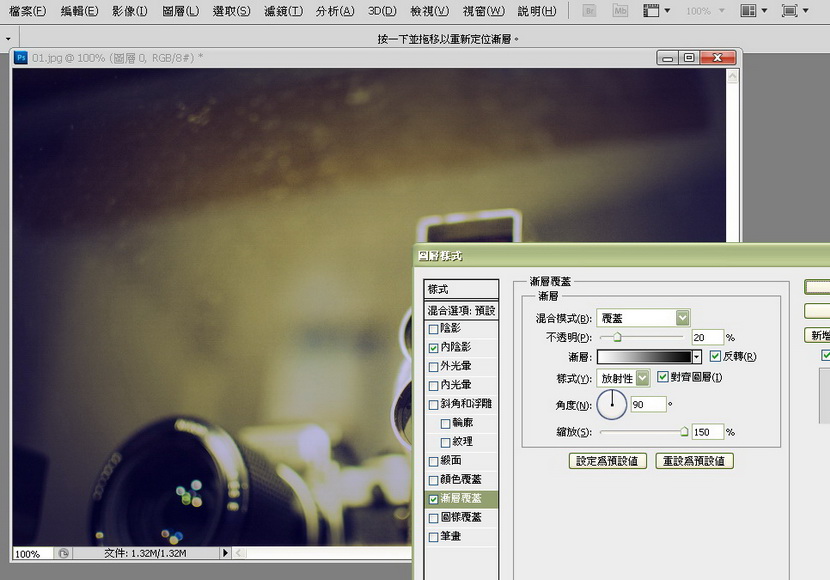 5) 继续"图层样式",今次是处理"渐层覆蓋"(Gradient Overlay),留意混合模式是"覆蓋"(overlay),其余设定如下︰