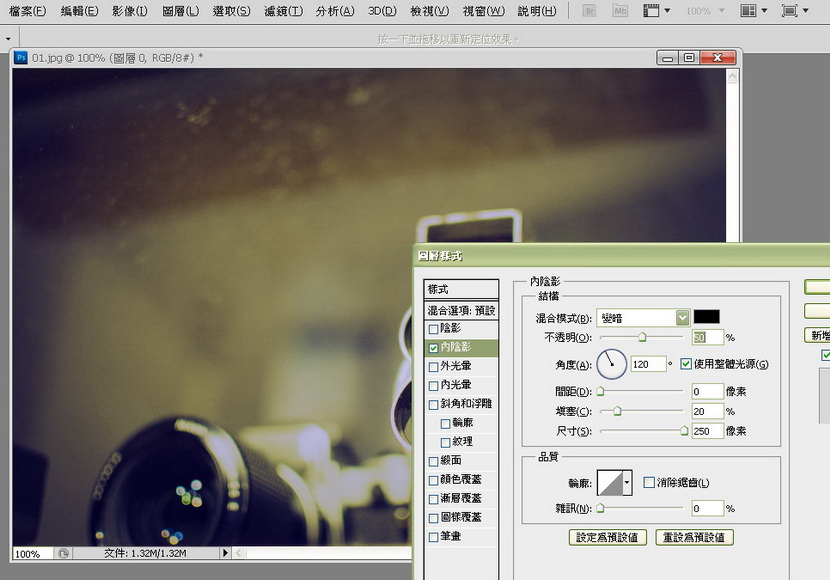 4) 然后 double click 背景,让图片变成图层,再 double click 开层"图层样式"。调整"内阴影",设定"变暗"(color burn),其设定见下图。