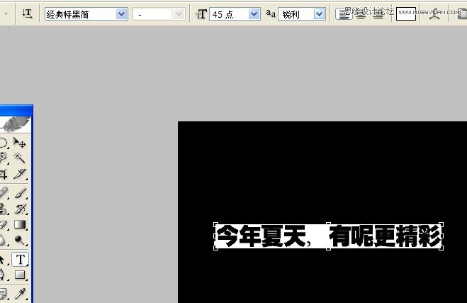 3、单击工具箱中的横排文字工具 ,输入文字,然后在工具选项栏上设置字体:经典特黑简,大小:45点,颜色:白色,设置消除锯齿的方法:锐利,如图3所示。