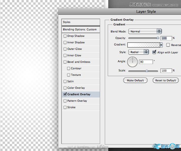 新建一个512x512的背景空白画布。双击图层,添加一个白色到透明的角度简便。