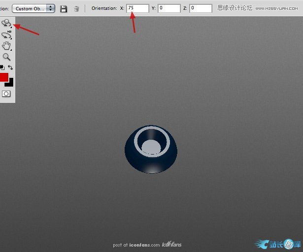 首先,按照你的想法改变3D模型的角度,这里笔者建议使用"对象旋转工具"将 X轴改成75°。
