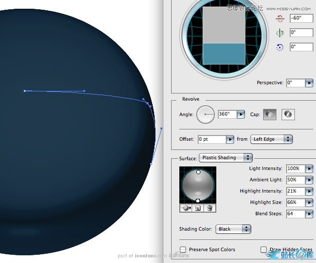 设置一个简单的360度绕转,并给他两个光源,同时,混合步骤设置为64。如果你没有看到这些设置选项,