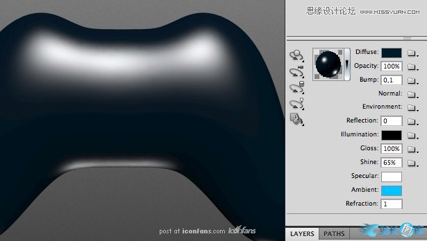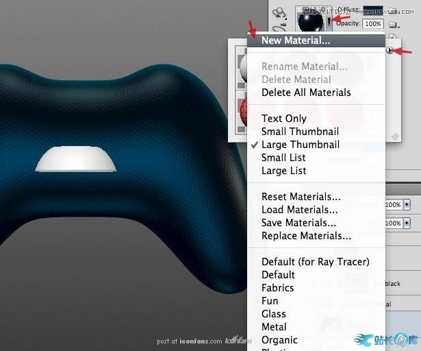 此时,需要再次使用我们的蓝色材质。选择游戏手柄主体图层,同时打开材质窗口,点击球体旁边的下拉小箭头,