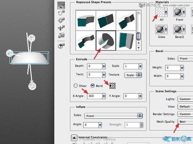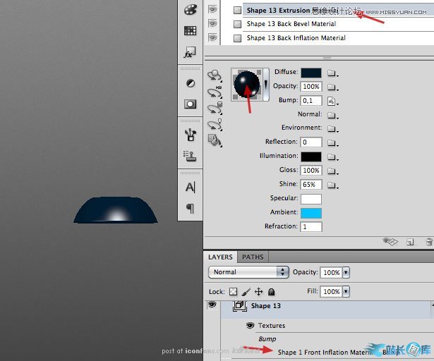 但我们这里使用凸出和斜角代替绕转。调整光源与角度并粘贴复制这个按钮到PHOTOSHOP中去。