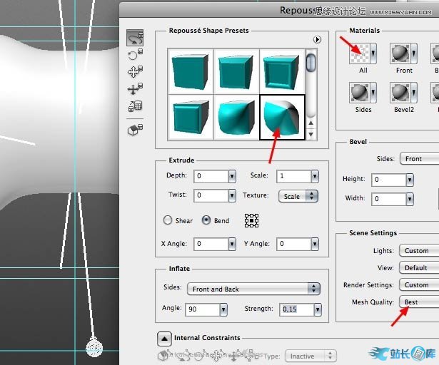 同制作游戏手柄主体时一样,点击3D> 凸纹 > 图层蒙板,这次我们选择"弯曲5",并在"凸出"中的"参考点位置"(译者注:就是那9个小点)