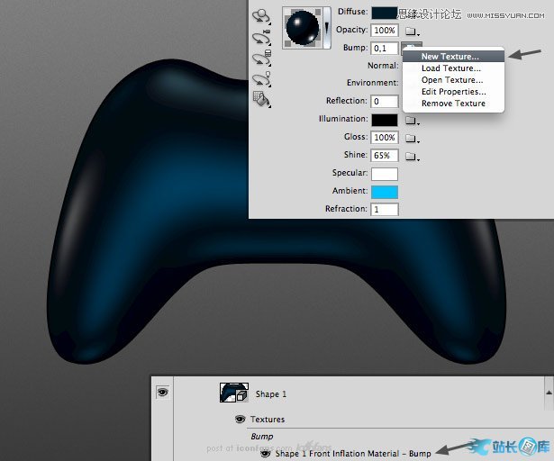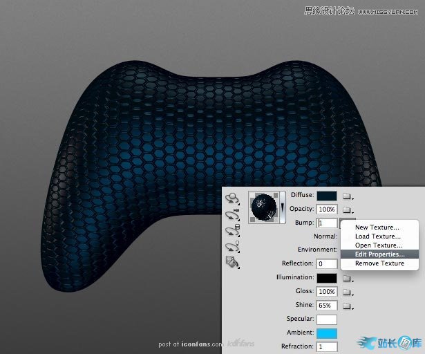 手柄的立体形状上,并且可以被光源照射到。我们来调整一下,设置凹凸数值为0.1,并点击编辑属性。