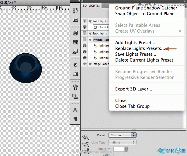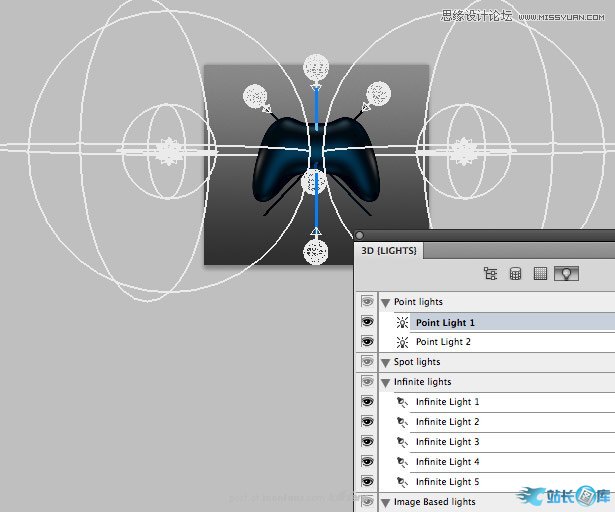 接下来让我在智能对象中继续操作。在我们想去掉边缘锯齿之前,我们需要先添加光源。在3D光源调色板里,
