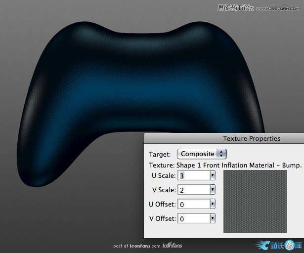 保存并关闭凹凸材质文件,你画的游戏手柄上应该已经平铺上了凹凸材质。看起来很丑,但材质是服帖的覆盖在了