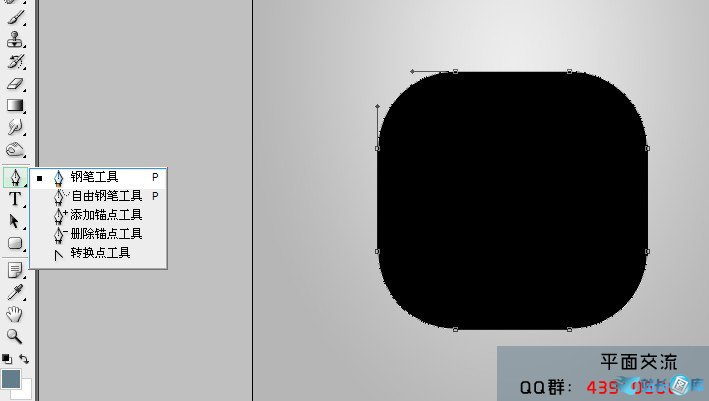 2.前景色设置纯黑,选择形状工具,形状圆角矩形工具,在背景上层拉出形状适当钢笔修改下,如下图
