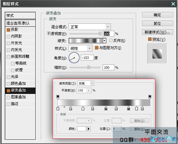 3.添加形状1的图层样式,渐变叠加 颜色-838383-020202-838383- 如下图