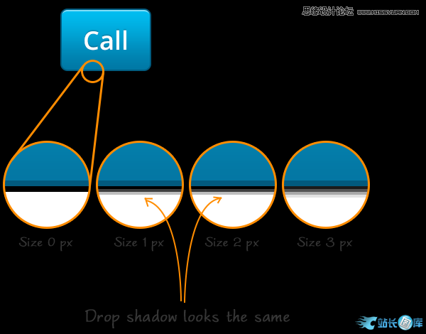 还记得诀窍1中关于保证尺寸和图层效果为偶数像素吗?你或许在对所有的都设置了偶数之后,仍然迷惑于为什么按钮的高度仍然是奇数。罪魁祸首便是 Photoshop的怪异之处,投影增加了尺寸。投影的大小(size)值设置为1px或者2px,投影将会产生同样的尺寸,如下图所示。