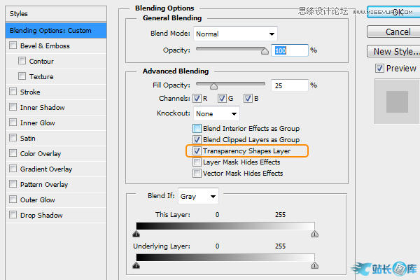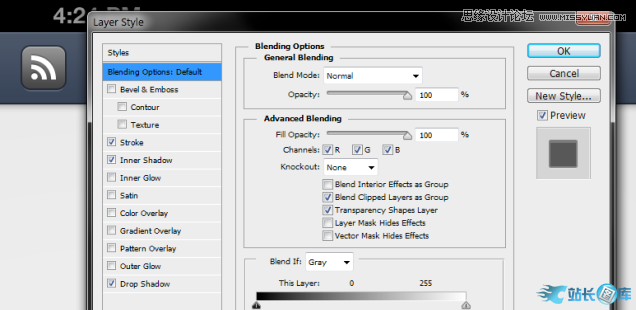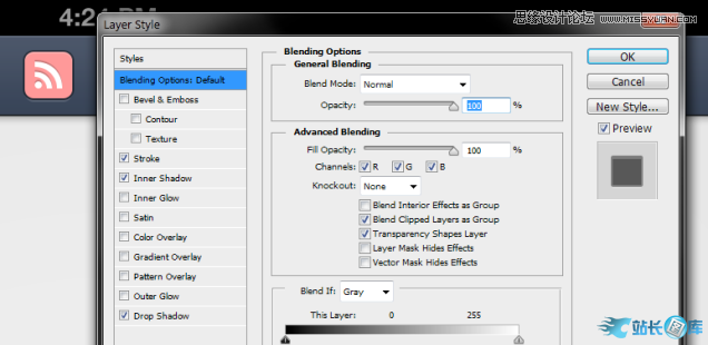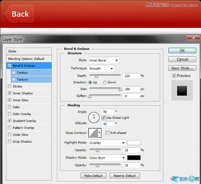 同样也可以使用图层混合选项中的斜面和浮雕。可以按下图所示来设置。通过调整设置来达到你想要的效果。通常调整的越为精妙效果也越为好看。