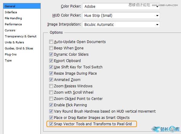这算是cs6中最好的改进之一了。按Ctrl + K 打开首选选面板选择将矢量工具与变换与像素网格对其(Snap Vector Tools and Transforms to Pixel Grid)勾选。在cs5中只有形状(没有变换)与像素网格对齐。像下图示在首选项〉常规中勾选最下面一项。