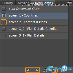 通过使用同样的工具去创建不同的屏幕,这样就保证了文件数量和大小达到了最小。并且,你和开发人员可以简单的通过单击图层复合名称前面的小盒子或者点击面板底部的往前/往后箭头来循环切换图层复合来展示不同的屏幕。