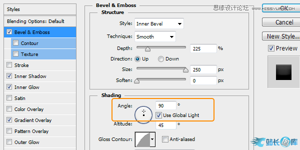 当光源在90°的时候高光、阴影以及其他图层效果看起来最好。为了避免重复设置,在混合选项中(斜面和浮雕、内发光和阴影)勾选使用全局光。或者选择图层〉图层样式〉使用全局光。