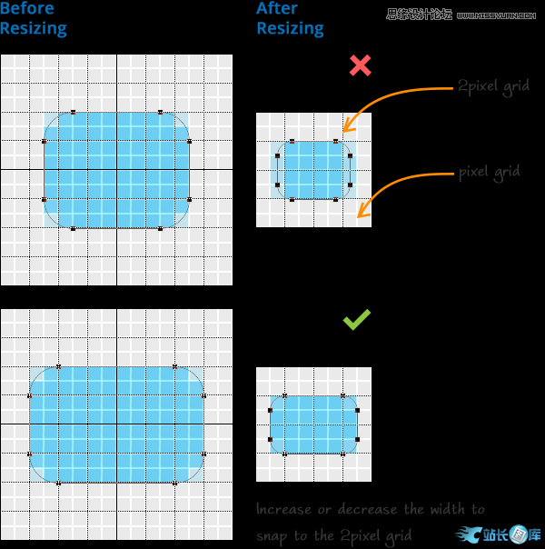 你是首先针对Retina屏幕设计然后再对标准分辨率的进行缩小是吧?为了在标准分辨率下像素仍然保持完美的呈现,你需要保证大小和距离为偶数。具体的做法便是:基于2ps的网格设计。在编辑(Edit)〉首选项(Preference)〉参考线、网格和切片(Cuides,Grids&Slices)。更改网格线间隔(Gridline)和子网格(Subdivisions)来是使得网格间隔线为2px。例如:设置网格线间隔为64px,子网格为32。