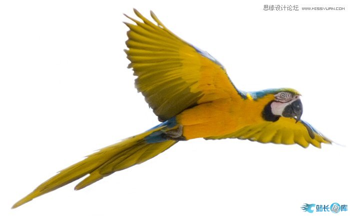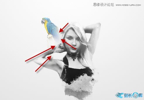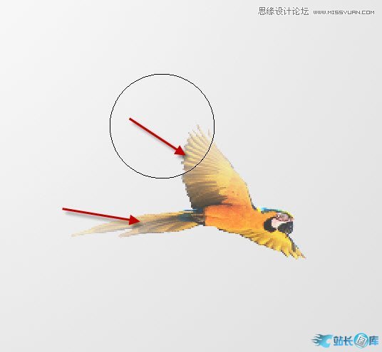 14、用软橡皮擦(用40%的流量和不透明度)擦掉鹦鹉图示的部分并增加一些光效。