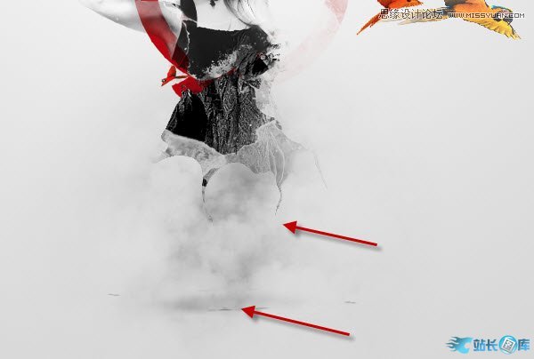 28、用"云笔刷"或者云彩滤镜添在模特造型的下方添加如下图所示的云和阴影效果。