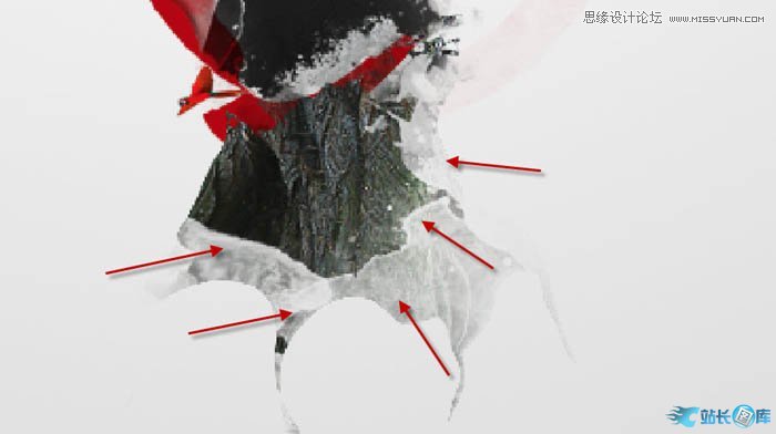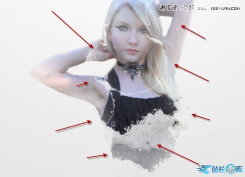 5、用裂痕笔刷作橡皮擦,擦掉模特某些部分,如图。在你用橡皮擦之前,调整为较小尺寸的笔刷。