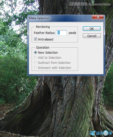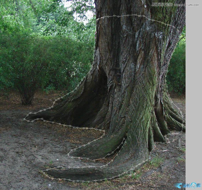 20、我们想加一些树纹理在模特身上,把树的素材拖进Photoshop,用钢笔工具绘制一个路劲,如图。