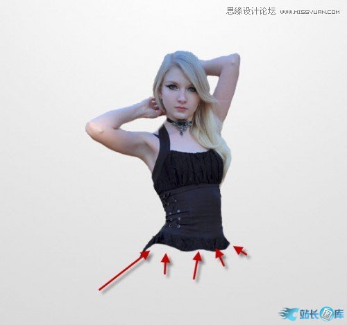 2、把模特图片拉进Photoshop里面,裁剪模特的上半身粘贴到我们新建的文件里,用橡皮擦工具(调整85%的硬度,为了是边缘不至于太僵硬甚至出现锯齿)擦掉模特下半身,如图。