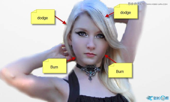 4、应用一些轻微减淡和加深效果用颜色减淡和加深工具(设置曝光度为10%)在模特上。