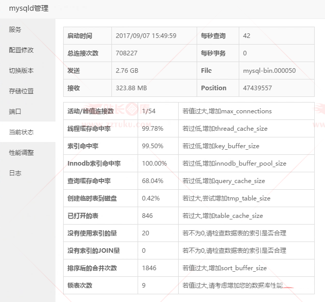 8、没有使用索引的量、没有使用索引的JOIN量 若不为0,就检查下数据表索引吧,其实只要没有疯涨,比如一天增涨几千,一般可以忽略,必竟优化索引还是程序员或DBA去干比较合适。