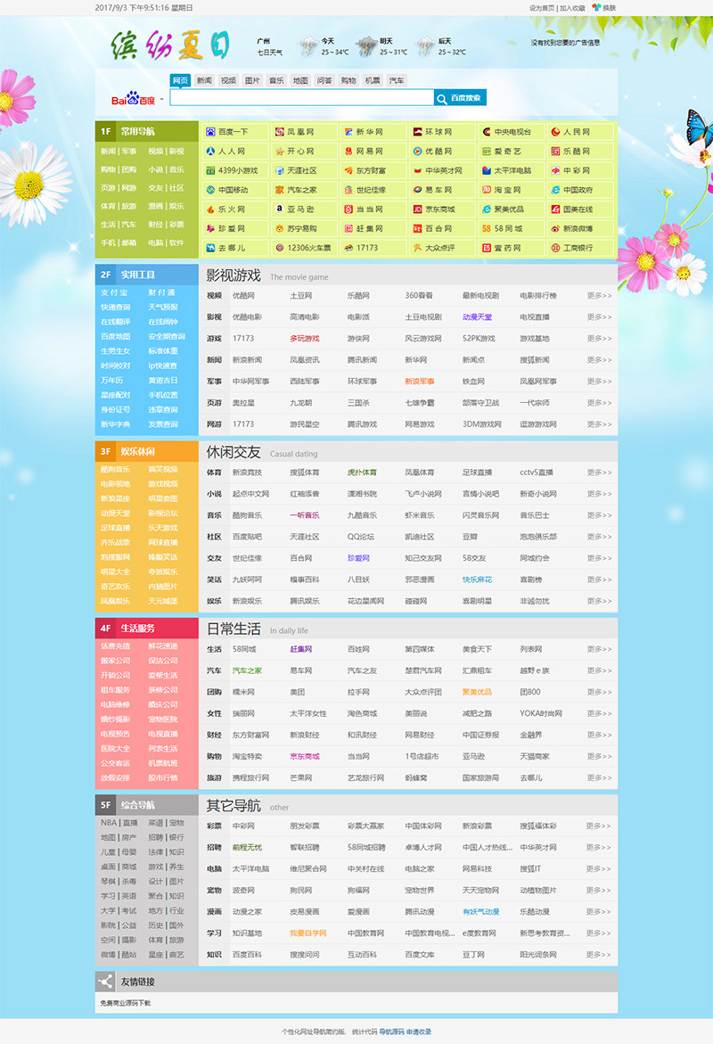 精致美观的“个性化缤纷夏日”网址导航源码,动态(带后台ASP+ACCESS)与静态(无后台)双版本,可换肤带4大系列41张背景。