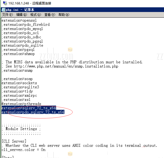 4、php7中 php.ini文件, ext是省略了php_.dll 如上图配置就行 , 当前需要把解压的文件拷贝到php\ext目录下