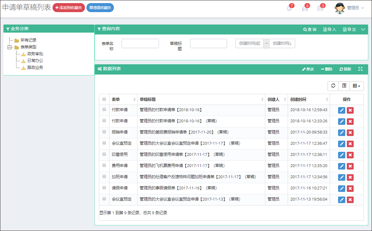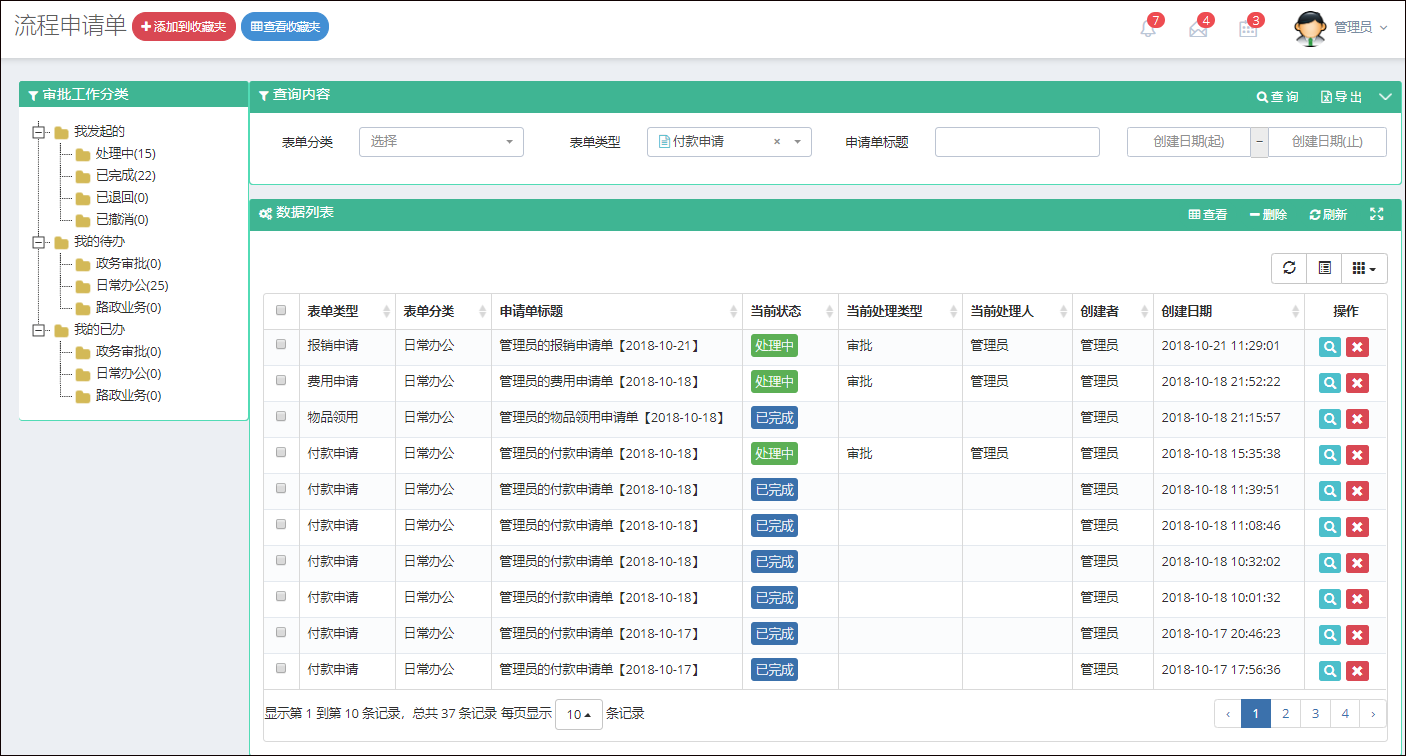 例如流程模板的分页展示和条件分类树形展示如下所示。