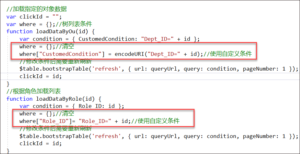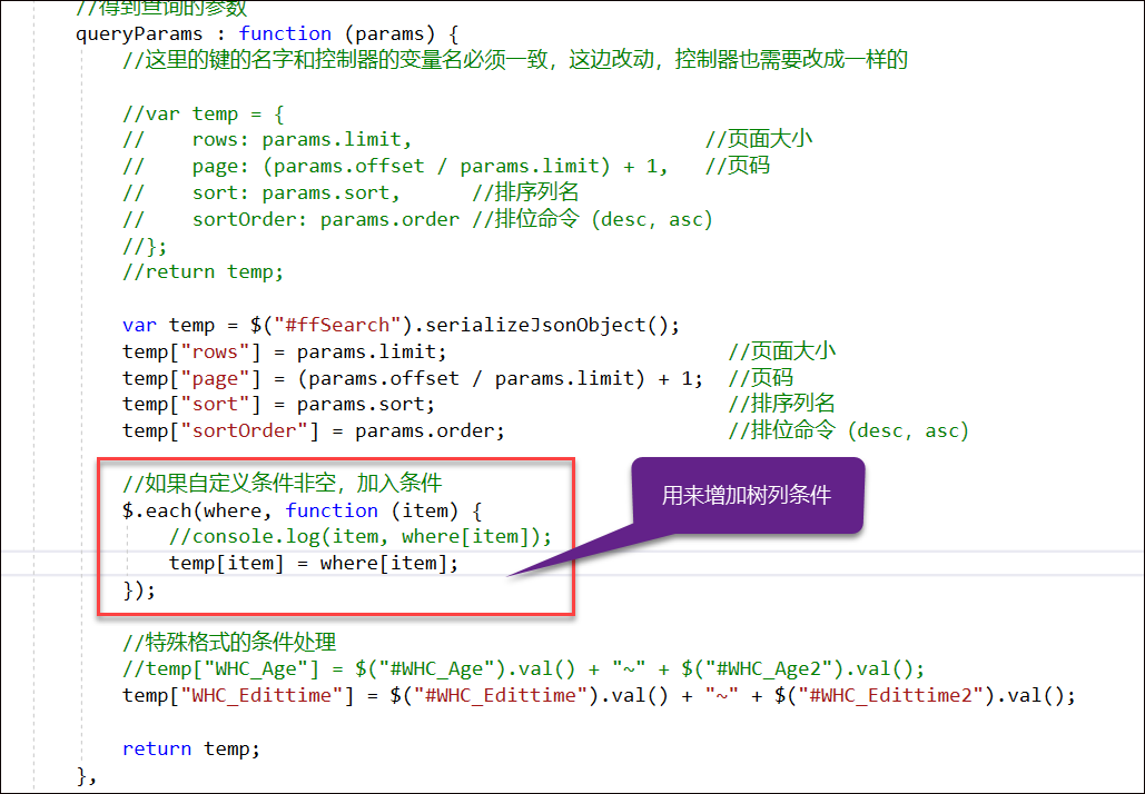 }这样处理后,我们在bootstrapTable表格插件的条件处理部分代码里面,可以增加对这个条件的处理即可。