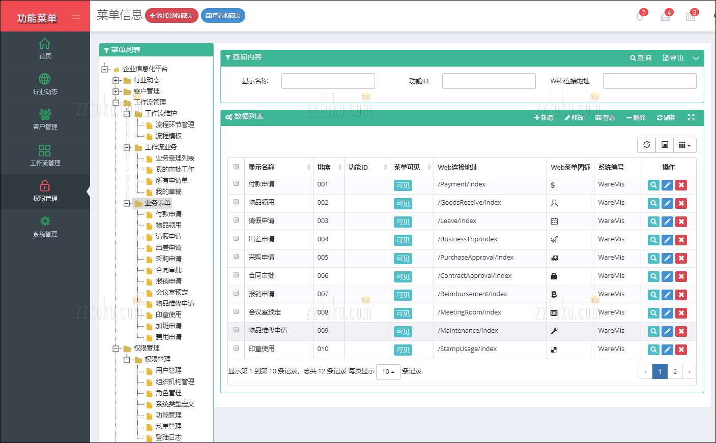 例如其中一个菜单的树形列表以及数据展示界面如下所示。