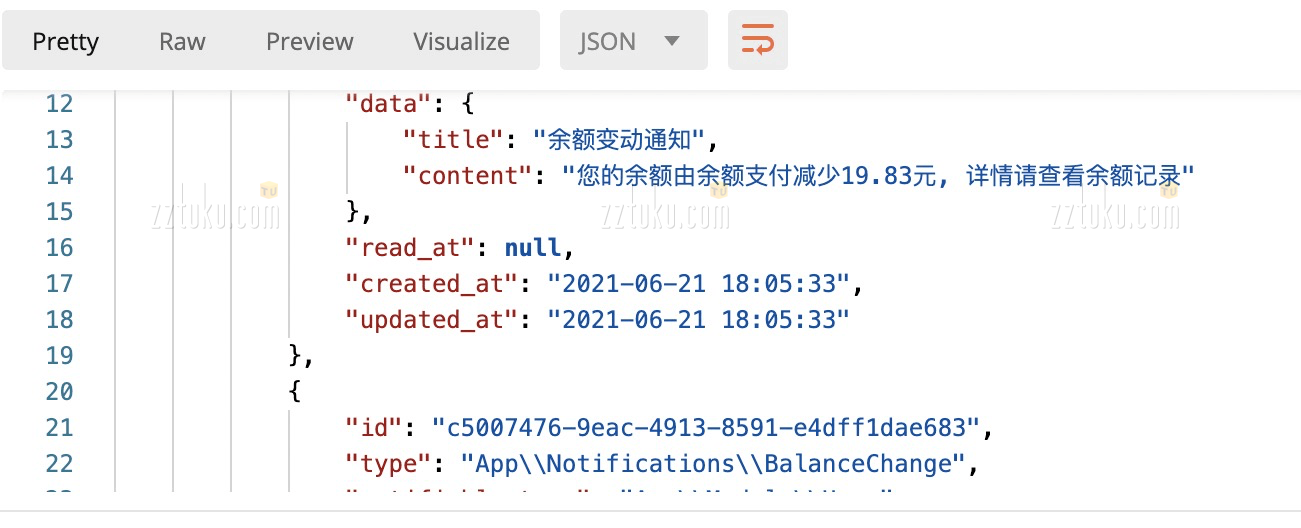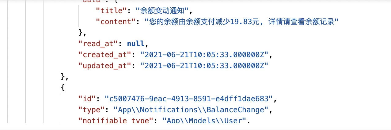 找到了问题所在,那就解决吧。首先定义自己的 Notification 模型类, 继承自框架自带的 Illuminate\Notifications\DatabaseNotification 类,再引用 HasDateTimeFormatter trait,代码如下: