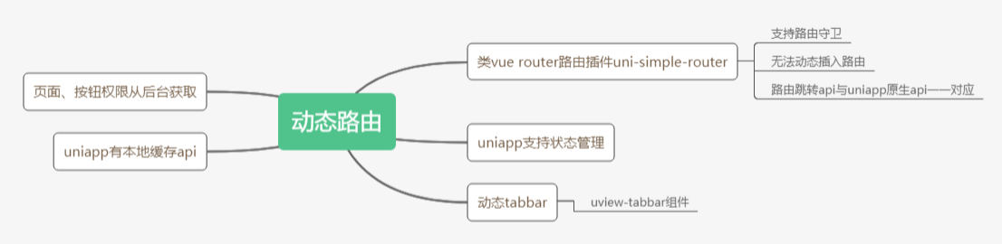第一个需求,前面提到过一些方案;第二个需求,动态tabbar,需要结合uview组件库的tabbar组件来实现。我们再分析下目前的框架、插件能力,糅合上述需求,就有这张图: