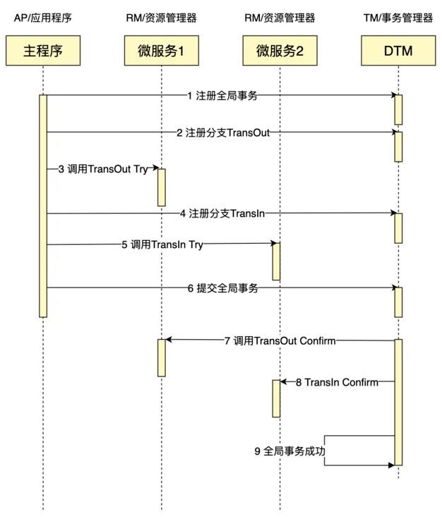 如果我们要进行一个类似于银行跨行转账的业务,转出(TransOut)和转入(TransIn)分别在不同的微服务里,一个成功完成的TCC事务典型的时序图如下: