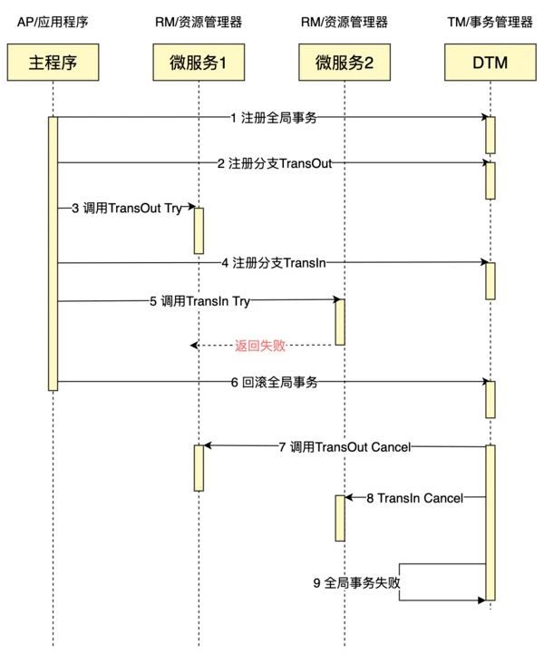 这个跟成功的TCC差别就在于,当某个子事务返回失败后,后续就回滚全局事务,调用各个子事务的Cancel操作,保证全局事务全部回滚。