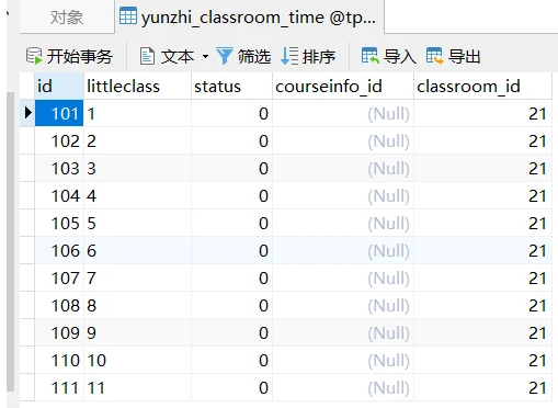 1、首先将每个教室的每一小节建立一个表,这里称作classroom_time,这些数据应该在增加教室字段时自动生成,以每天11个小节为例,每个教室生成11个classroom_time字段,如图。