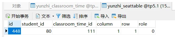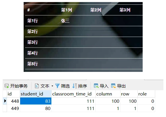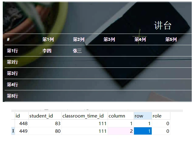 2、每个座位应该也要存入一个字段用于保存它的行列数,学生id和所对应的classroom_time_id用于保存它是哪个教室的哪个小节的座位。我们在这里称之为seattable,初始为0条数据。