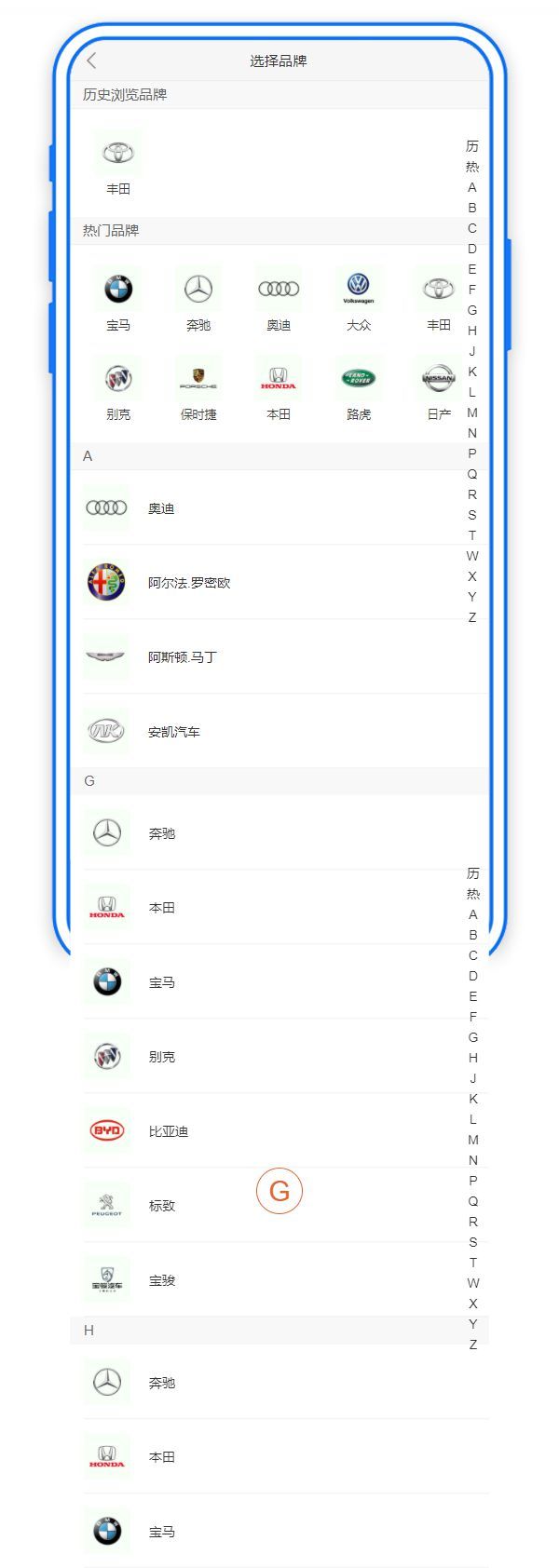 手机APP买卖汽车品牌选择列表页面模板,汽车品牌频道手机导航页面html模板。热门品牌:宝马、奔驰、奥迪、大众、丰田、别克、保时捷、本田、路虎、日产。