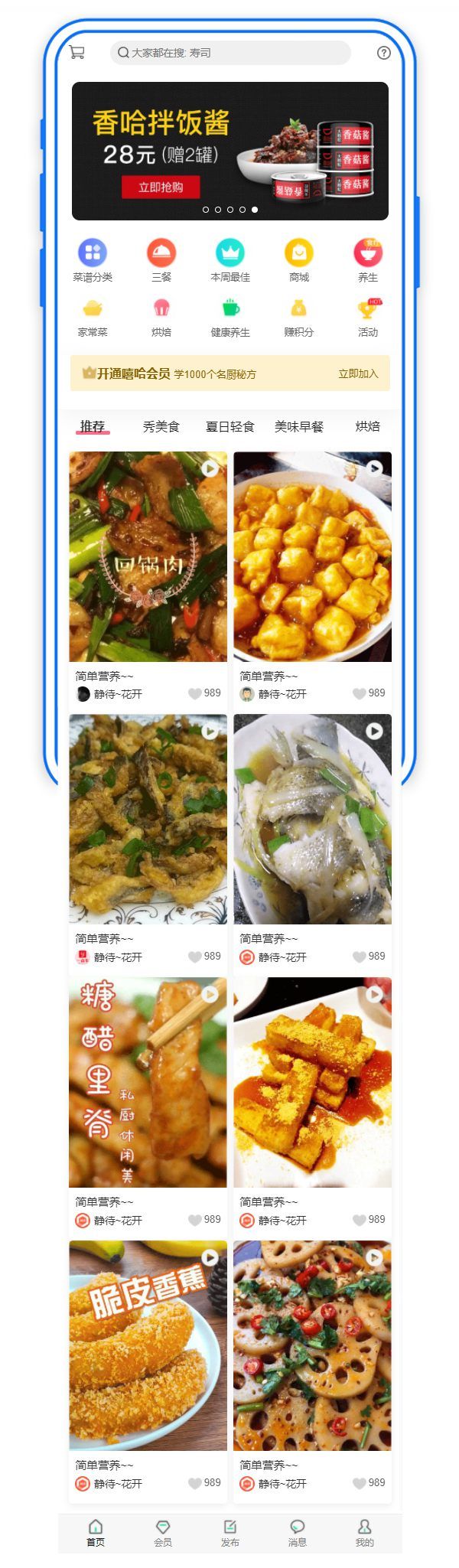 移动美食食谱介绍,美食点评手机网站页面模板。 食谱分类,三餐,每周最佳,购物中心,保健,家庭烹饪,烘烤,保健,赚取积分,活动,推荐,表演食物,夏季便餐,美味早餐,烘烤等。
