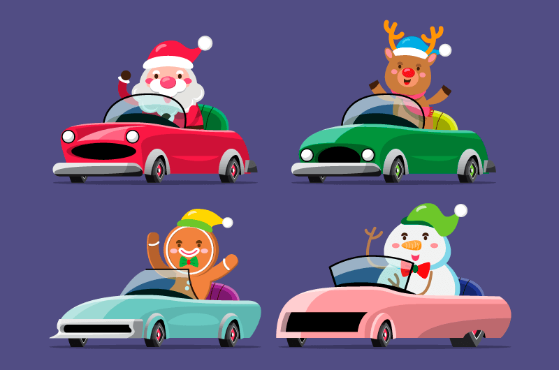 四个开着汽车的圣诞人物矢量素材