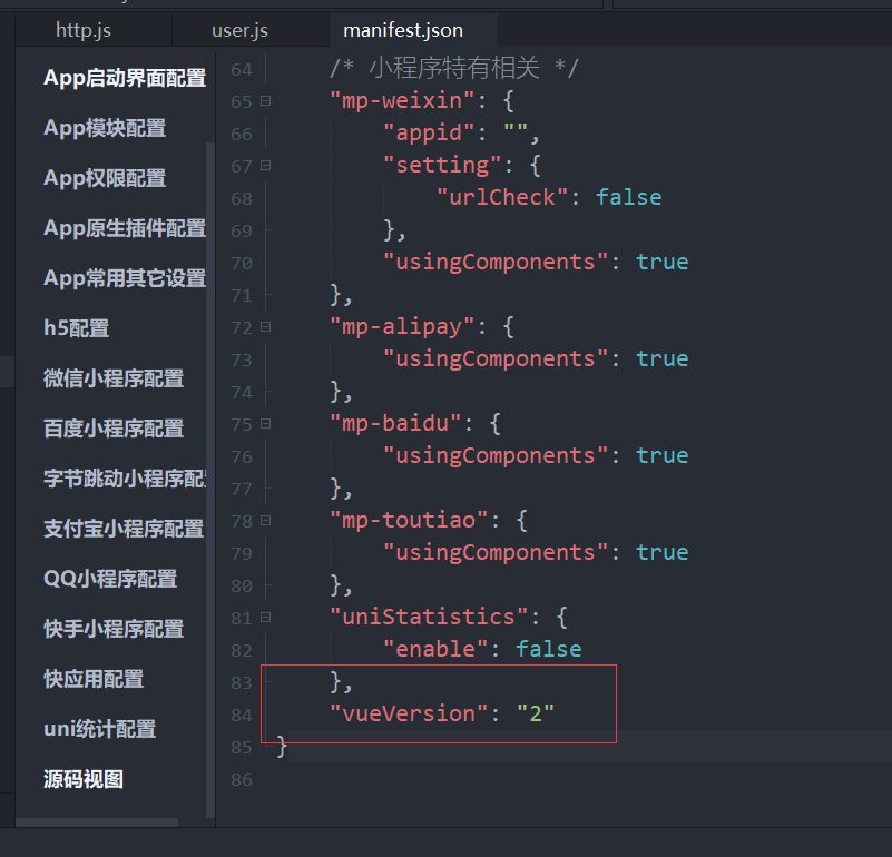 此种配置方式,可能会没用,因为 vue.config.js 是 vue3 才有的, vue2 配置 vue.config.js 是无效的。可以在 manifest.json 文件内通过 vueVersion 字段来查看 vue 版本。如下图: