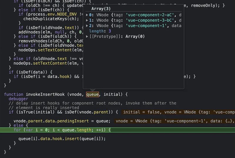 到这里就很清晰,子组件insert进父节点后,并不会马上调用mounted钩子,而是把组件对应到vnode插入到父vnode的insertedVnodeQueue中,层层递归,最终根组件拿到所有子组件的vnode,再依次循环遍历,调用vnode的insert钩子,从而调用了mounted钩子。这里是先进先出的,第一个被push进去的第一个被拿出来调用,所以最深的那个子组件的mounted先执行。最后附上一张源码调试的图,可以清晰的看到根组件的insertedVnodeQueue是什么内容。