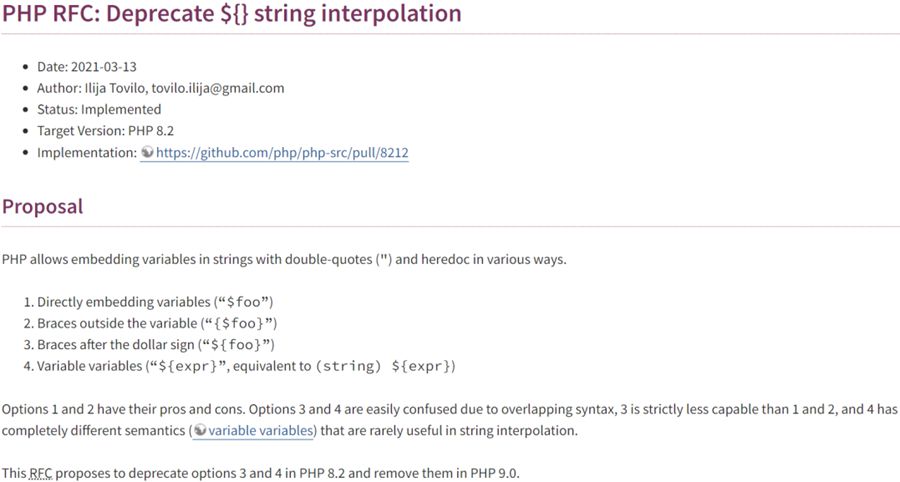 PHP 社区 4 月底通过了一项只有一张反对票的提案,提案内容是在即将发布的 PHP 8.2 中,不再支持使用 ${} 在字符串中插入变量的语法(标记为弃用状态),并在 PHP 9 删除该语法。