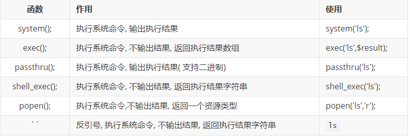 passthru()函数可以执行系统命令, 并将执行结果输出到页面中, 与system()函数不同的是, 它支持二进制的数据, 更多的用于文件, 图片等操作, 使用时直接在参数中传递字符串类型的系统命令即可