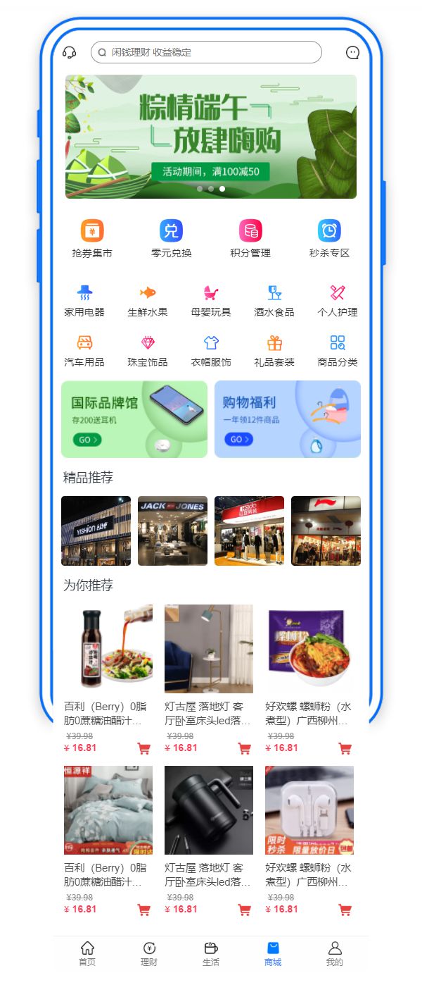 手机端生活类商城首页静态模板,一款通用的金融理财生活类商城手机模板,包含了抢券集市 、零元兑换 、 积分管理、 秒杀专区 、家用电器 、 生鲜水果、 母婴玩具、 酒水食品、 个人护理 、 汽车用品 、 珠宝饰品 、衣帽服饰 、礼品套装、 商品分类等。