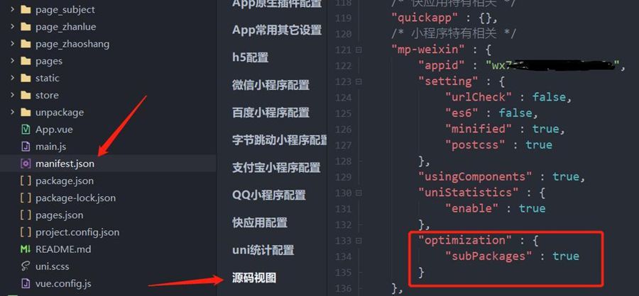 在对应平台的配置(manifest.json)下添加"optimization":{"subPackages":true}开启分包优化